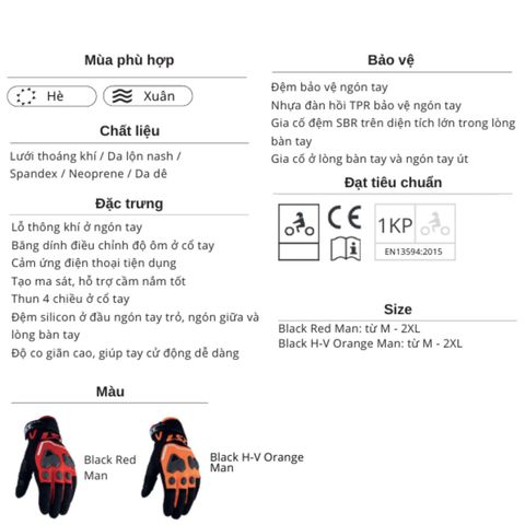 Găng tay moto LS2 Vega Man đạt tiêu chuẩn châu Âu EN 13594: 2015.